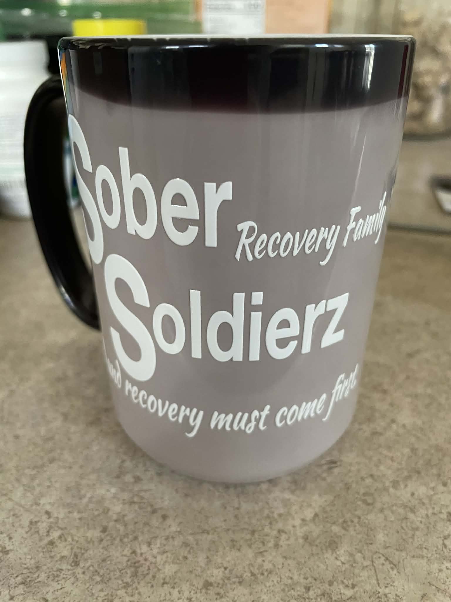 Black mug with heat applied color changing technology, displays Sober Soldierz Recovery Family God and Recovery must come first. Uses UV technology that bonds to hard surfaces.