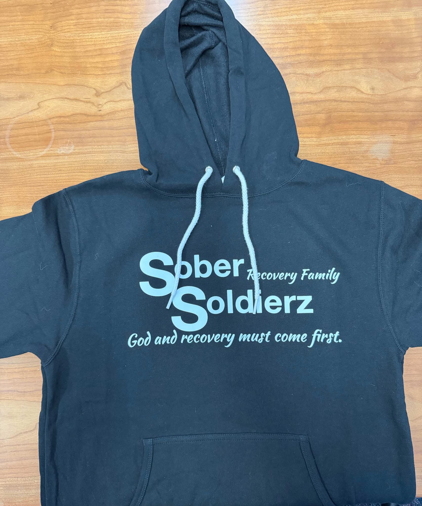 Black hoodie with Sober Soldierz Recovery family God and recovery must come first. This is in a size large