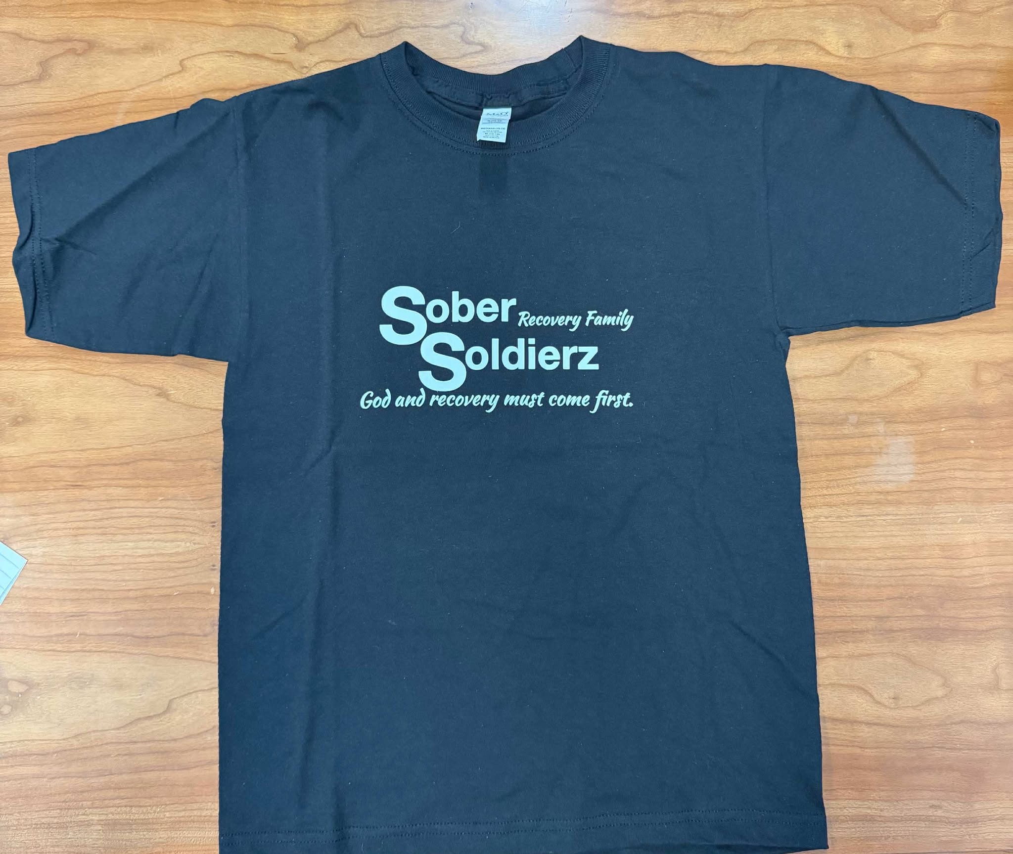 Black tshirt with “Solder Soldierz recovery family God and recovery must come first” in Large